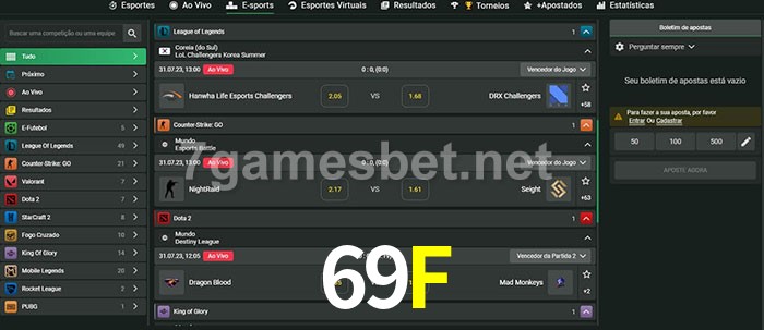 O 69F oferece uma grande seleção de opções de apostas em e-sports com probabilidades competitivas